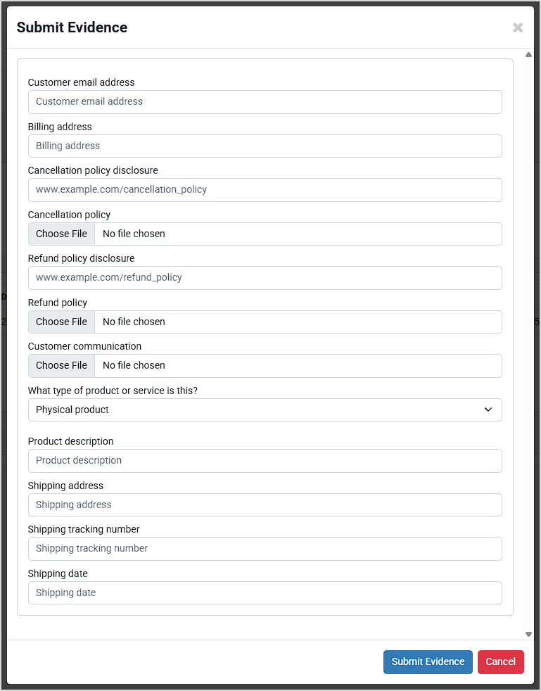 The Submit Evidence area contains the following data fields you can submit to dispute the chargeback: