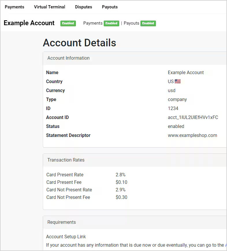 When a user first logins in, they are taken to the Account Details page. At the top of the page, users can see their Account Status, Payment Status, and Payouts Status. If an account has not completed their application, then these statuses will remain Disabled. Once the account has been completed and approved, these statuses will change.